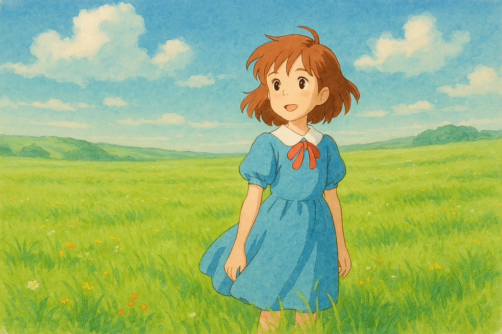 - “석양이 드리우는 언덕 위에서 검은 고양이와 걷는 소녀, 지브리풍, 수채화 느낌, 은은한 빛 강조”