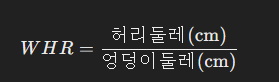허리-엉덩이 비율(WHR, Waist-Hip Ratio)은 복부 비만 여부를 평가할 때 사용됩니다. 복부 비만은 심혈관 질환과 당뇨병의 주요 원인 중 하나이므로, WHR은 BMI와 체지방률을 보완하는 중요한 지표로 활용됩니다.